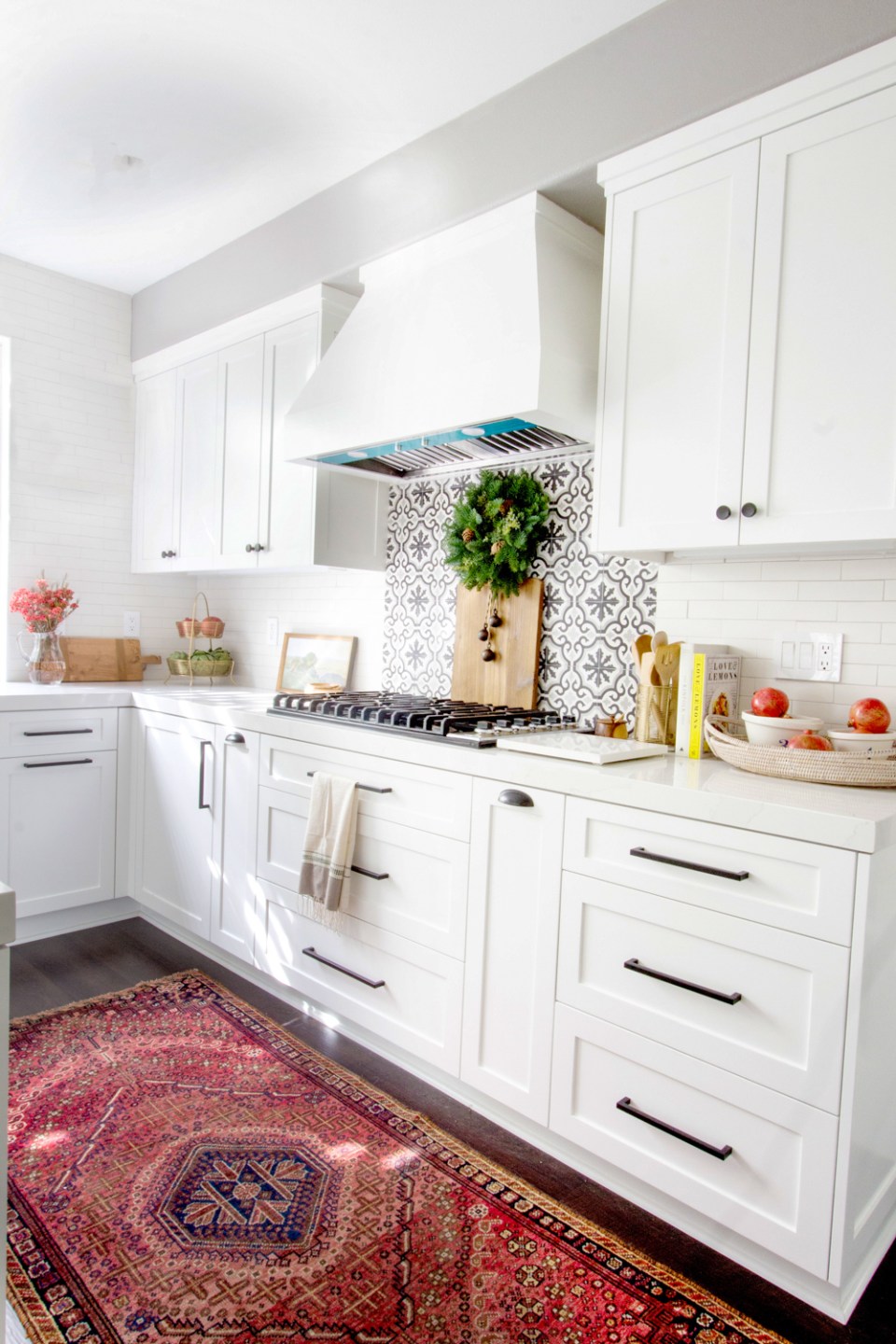 Going with the black and white theme, we went with a beautiful cement tile pattern for the range backsplash. And then 3×9 white subway tile all the way up. My client initially didn’t realize she wanted the custom wood range hood. That’s until I designed it and showed her. I’m so glad we did it. It adds such refined detail and keeps everything cohesive. Having a blaring silver metal range hood wasn’t in my design vision for their kitchen.