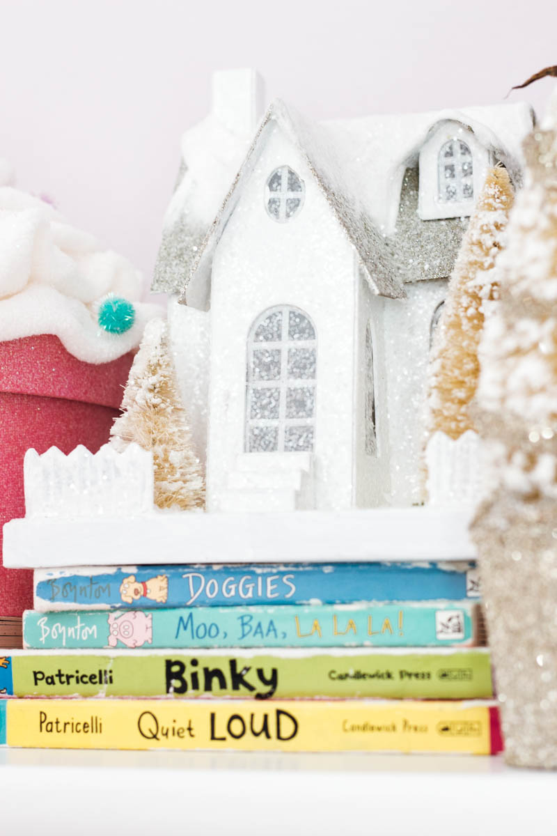 3. Once we got the ball rolling, we just layered and added fun pieces. We mixed Christmas and holiday-themed books, their beloved winter stuffed animals, Christmas houses and bottle brush trees I picked up at an infamous local after Christmas sales a few years ago.