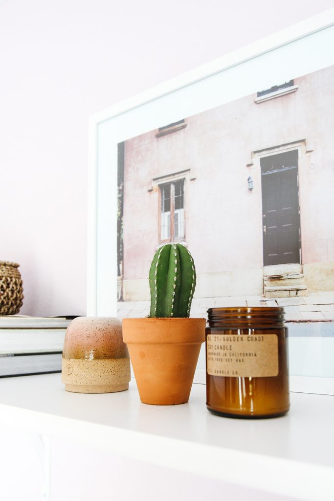 A few essentials that help strengthen your shelf game are artisan ceramics, tiny plant babies (or big), books, art and candles.