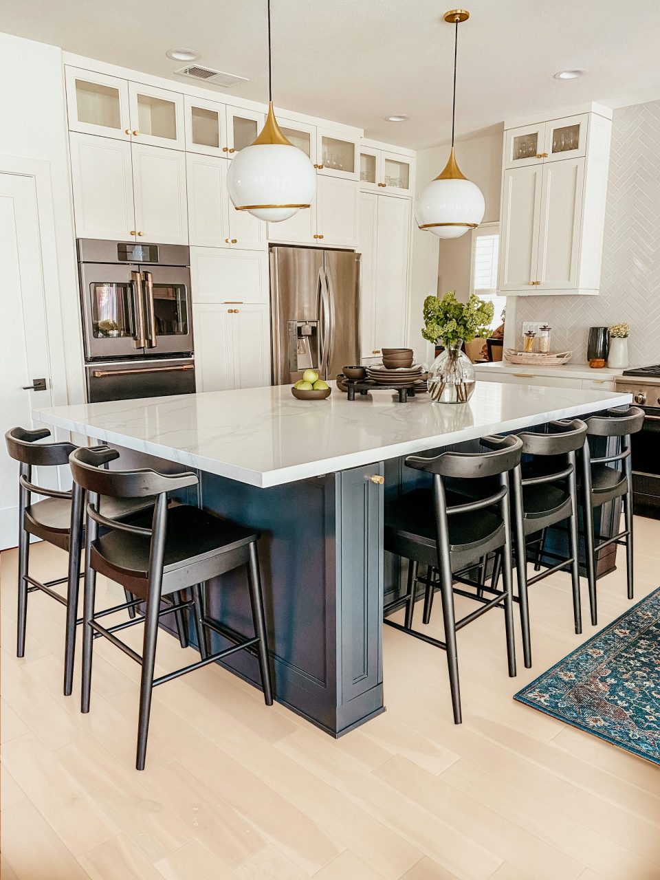 Now that we had a clear path out into the backyard, we upgraded the heavy sliding doors to bright french doors that let in so much more natural light! The work with the bright white counter, which instantly attracts the eyes, visually expanding the room! All that light allowed us to take the island’s color in a much moodier direction.